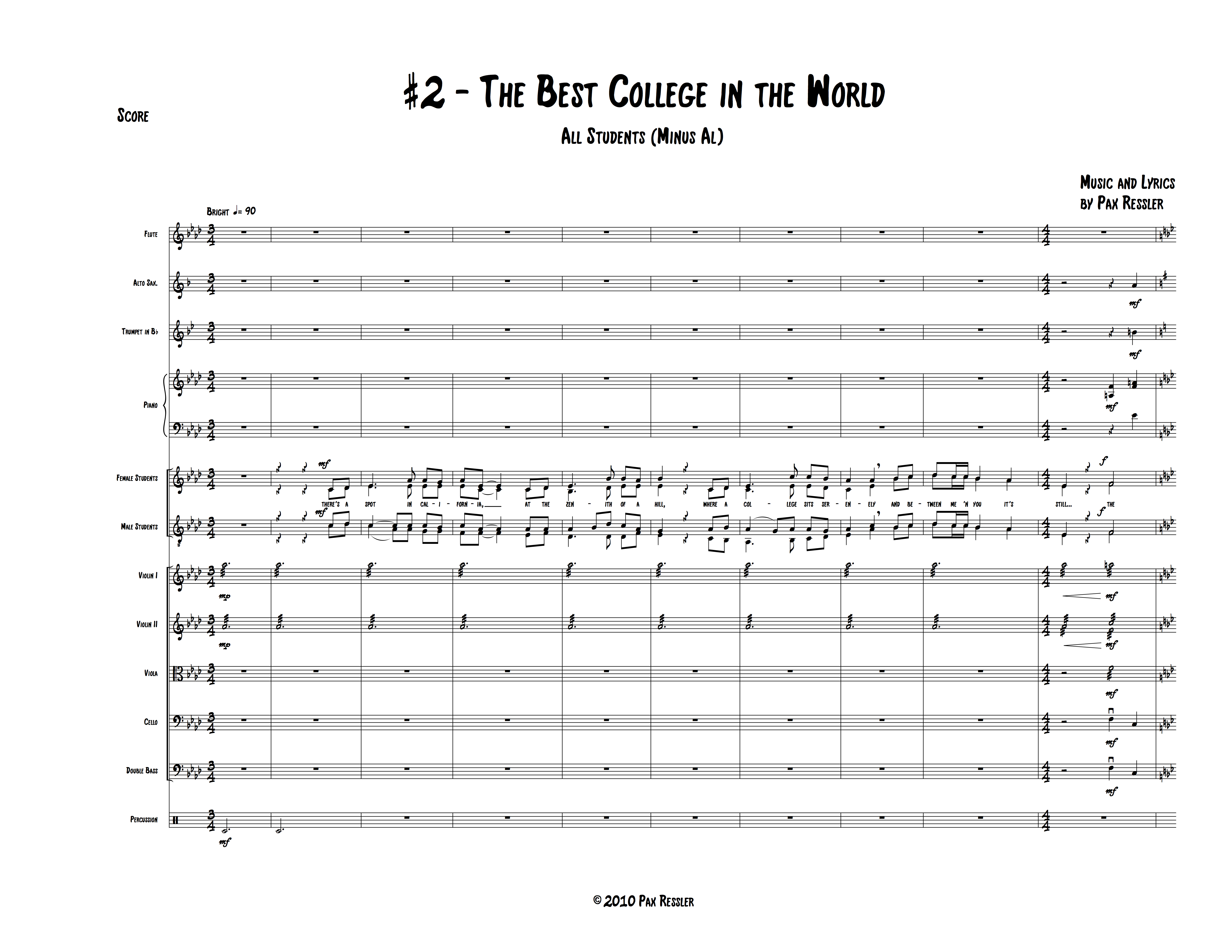 Music and Lyrics by Pax Ressler, commissioned by Brayton Bollenbacher; TTBB chorus, piano, two violins, electric bass and drums